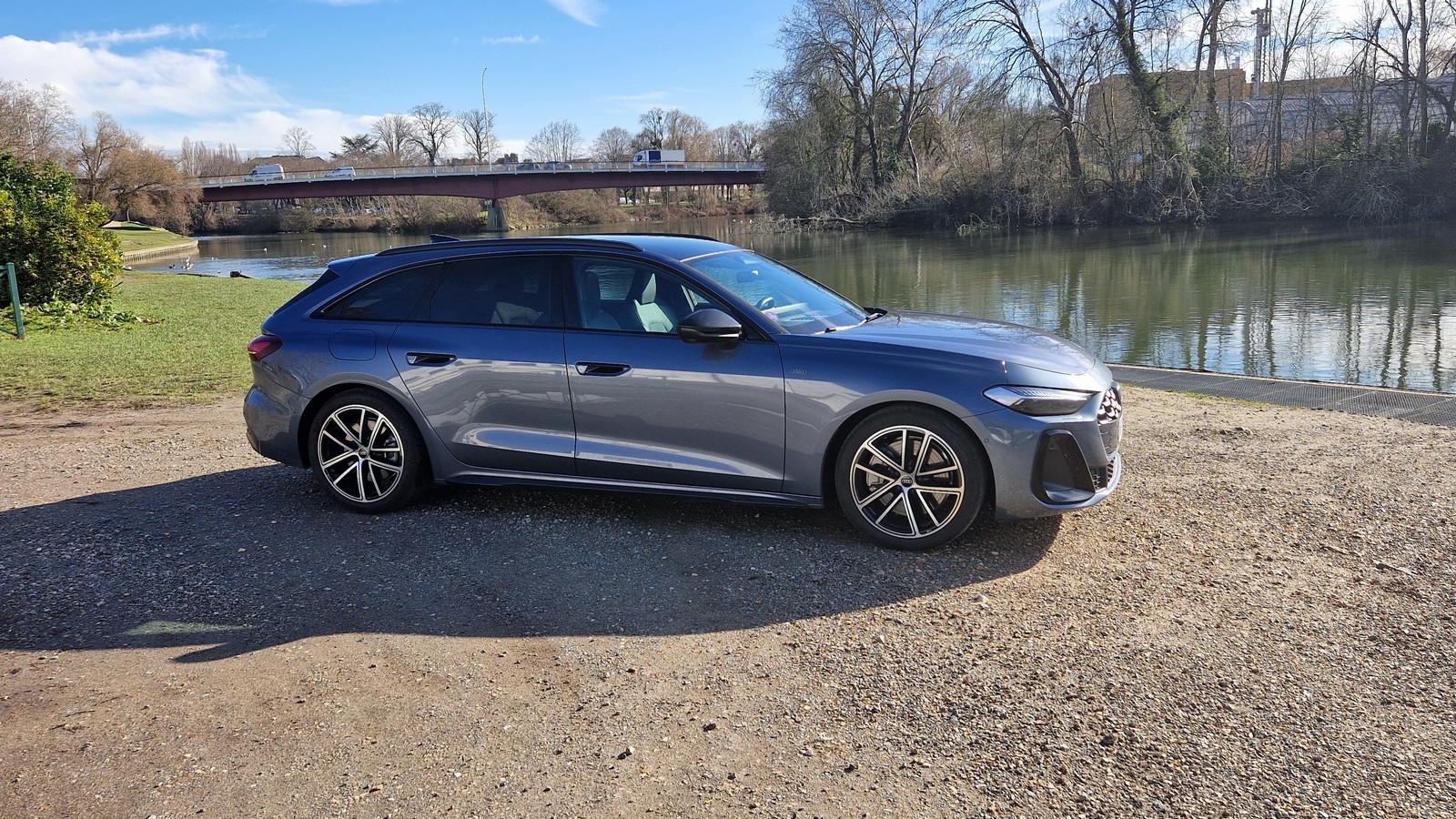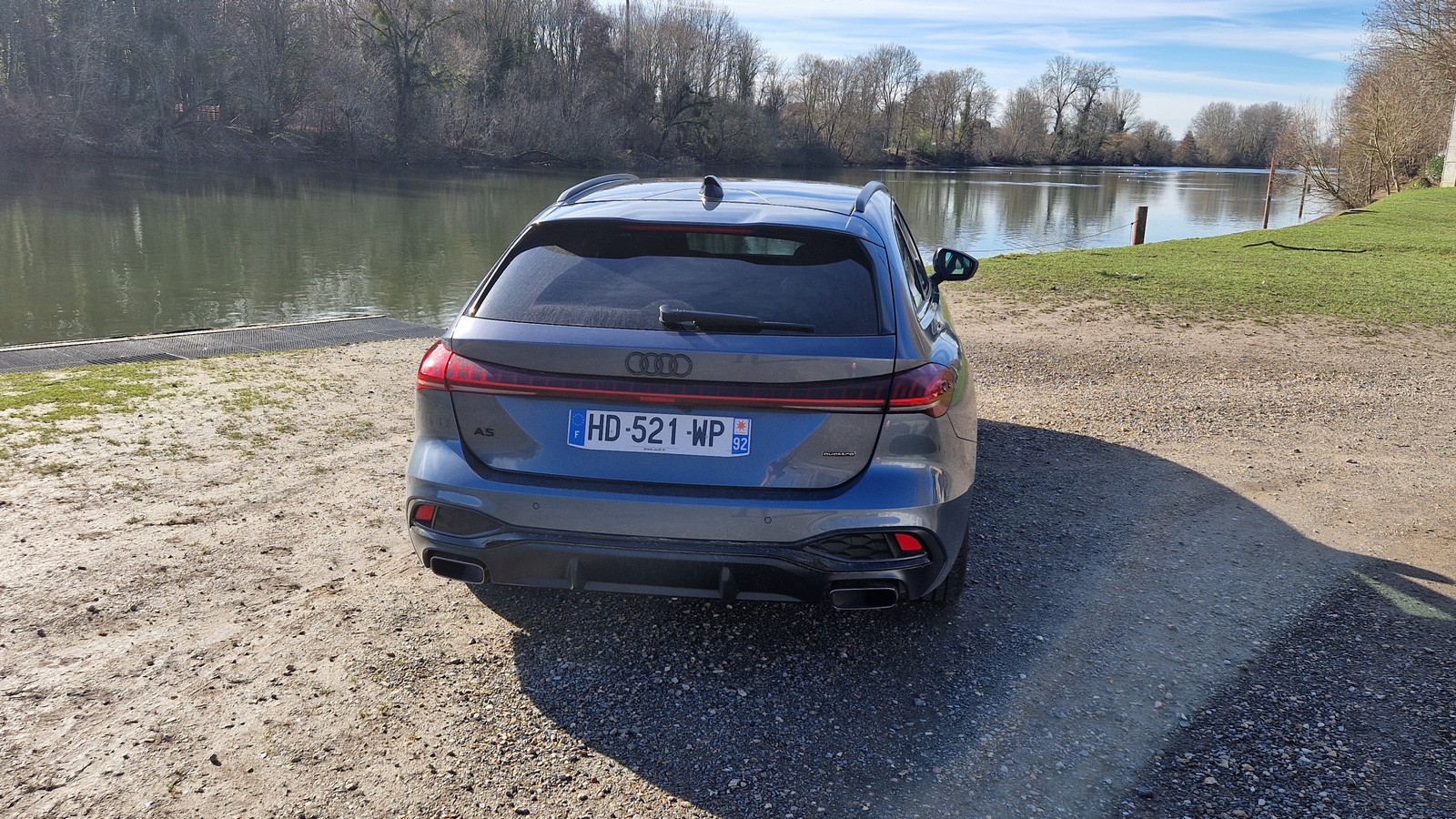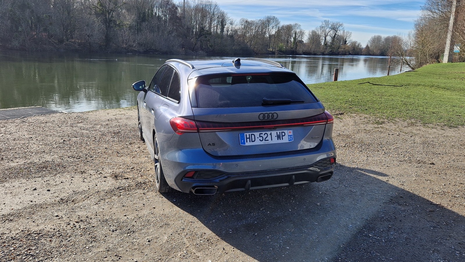 L’AUDI A5 Avant E-hybrid ne dénature en rien l’allure raffinée qui a fait le succès de la gamme A5. La ligne générale est basse et horizontale, les flancs sculptés et les épaules légèrement saillantes renforcent le dynamisme. La calandre « Singleframe », caractéristique d’AUDI, s’étire en largeur et s’intègre parfaitement aux optiques avant effilées. Les touches chromées ou noires laquées, la signature lumineuse LED à l’arrière et les lignes tendues du parechoc participent à une esthétique sobre mais sophistiquée. Même si cela reste toujours une affaire de goût, je trouve que cette A5 fait partie des breaks les plus élégants du marché. L’équilibre entre élégance et sportivité est particulièrement réussi.