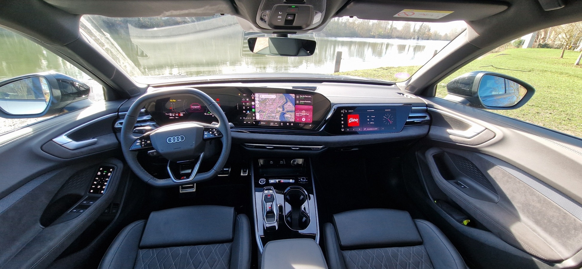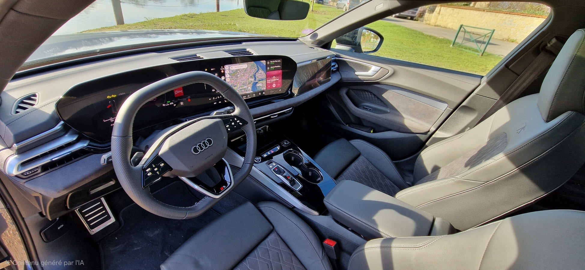À bord, l’AUDI A5 Avant E-hybrid confirme le standing attendu d’un véhicule premium. La finition intérieure est bien sûr haut de gamme, avec des matériaux agréables au toucher, mais l’absence de certaines textures « soft-touch » sur les parties basses du tableau de bord ou certaines garnitures de porte peuvent rappeler que l’habitacle, malgré son allure sophistiquée, n’atteint pas le niveau d’exception de certains anciens modèles de la marque aux anneaux.