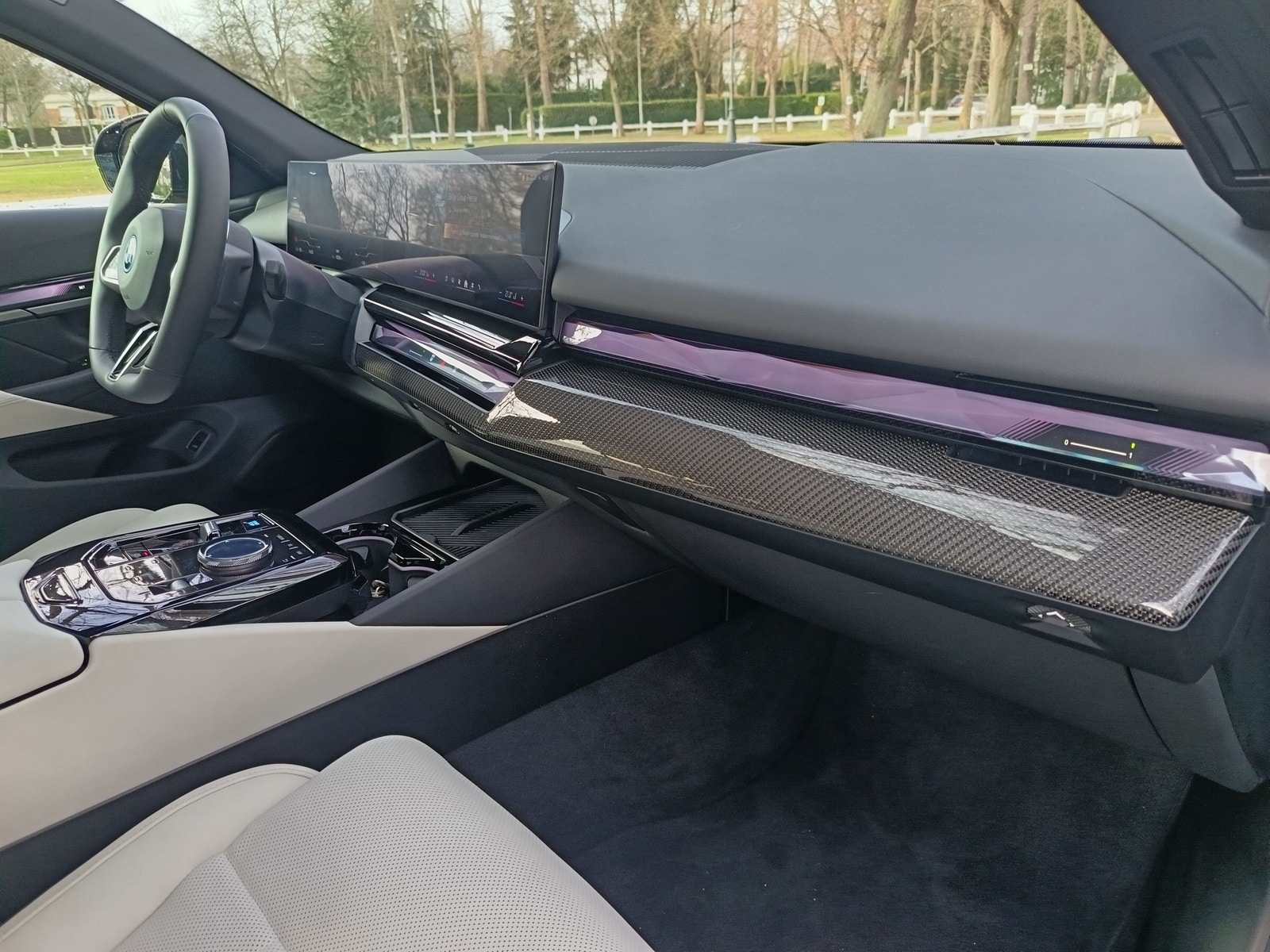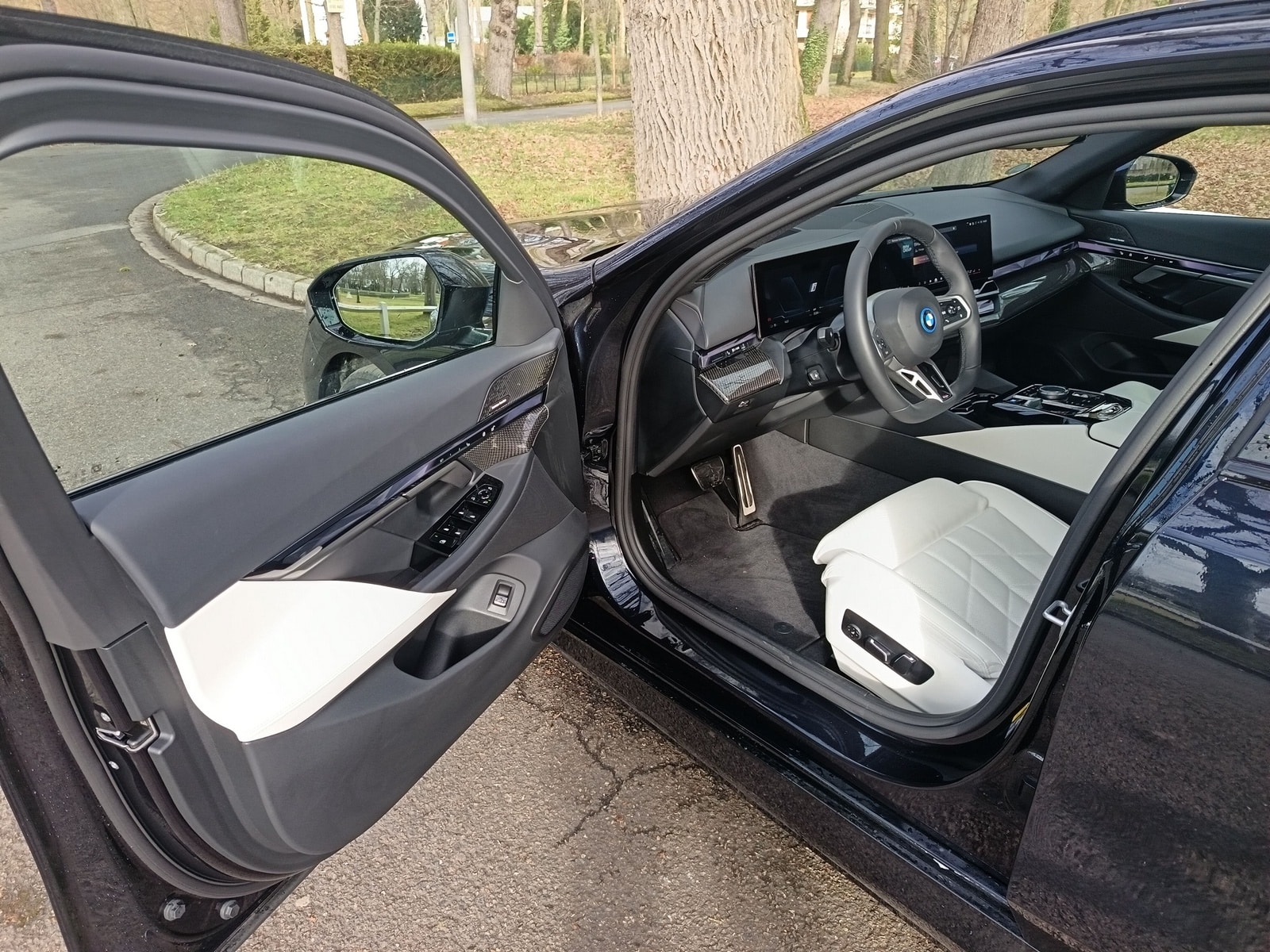 À bord, la BMW i5 Touring reprend l’habitacle de la berline. L’ambiance est moderne et technologique, dominée par le BMW Curved Display regroupant instrumentation et système multimédia. La présentation est flatteuse, les assemblages sérieux et les matériaux de bonne qualité, même si certains plastiques noirs restent moins valorisants.